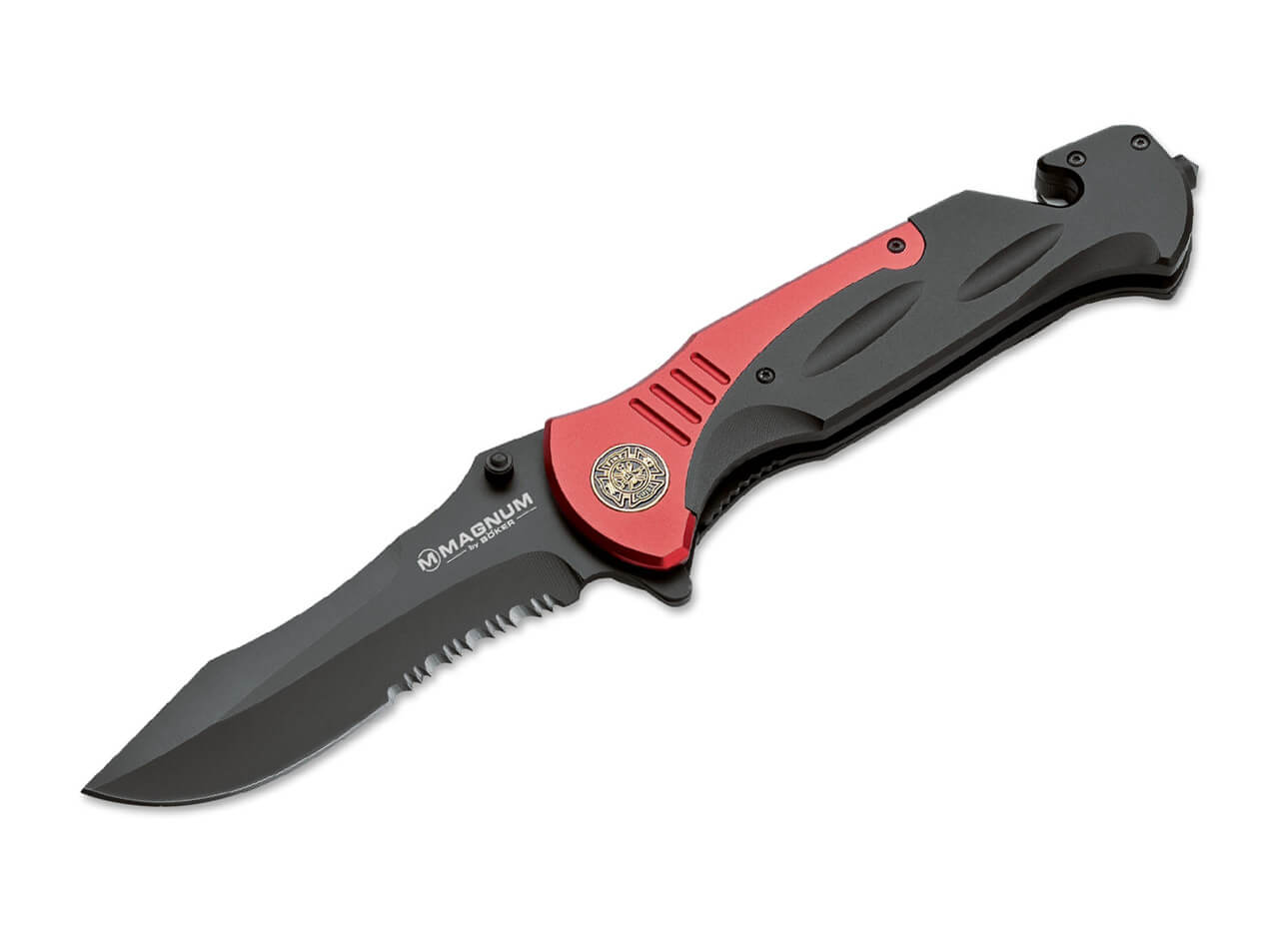 The Magnum Fire Chief is a remarkable rescue knife designed for emergency situations.It is truly a massive knife, so be prepared for an extra-large folding knife experience. If you're looking for a smaller version, check out the Boker Magnum Firefighter Linerlock.