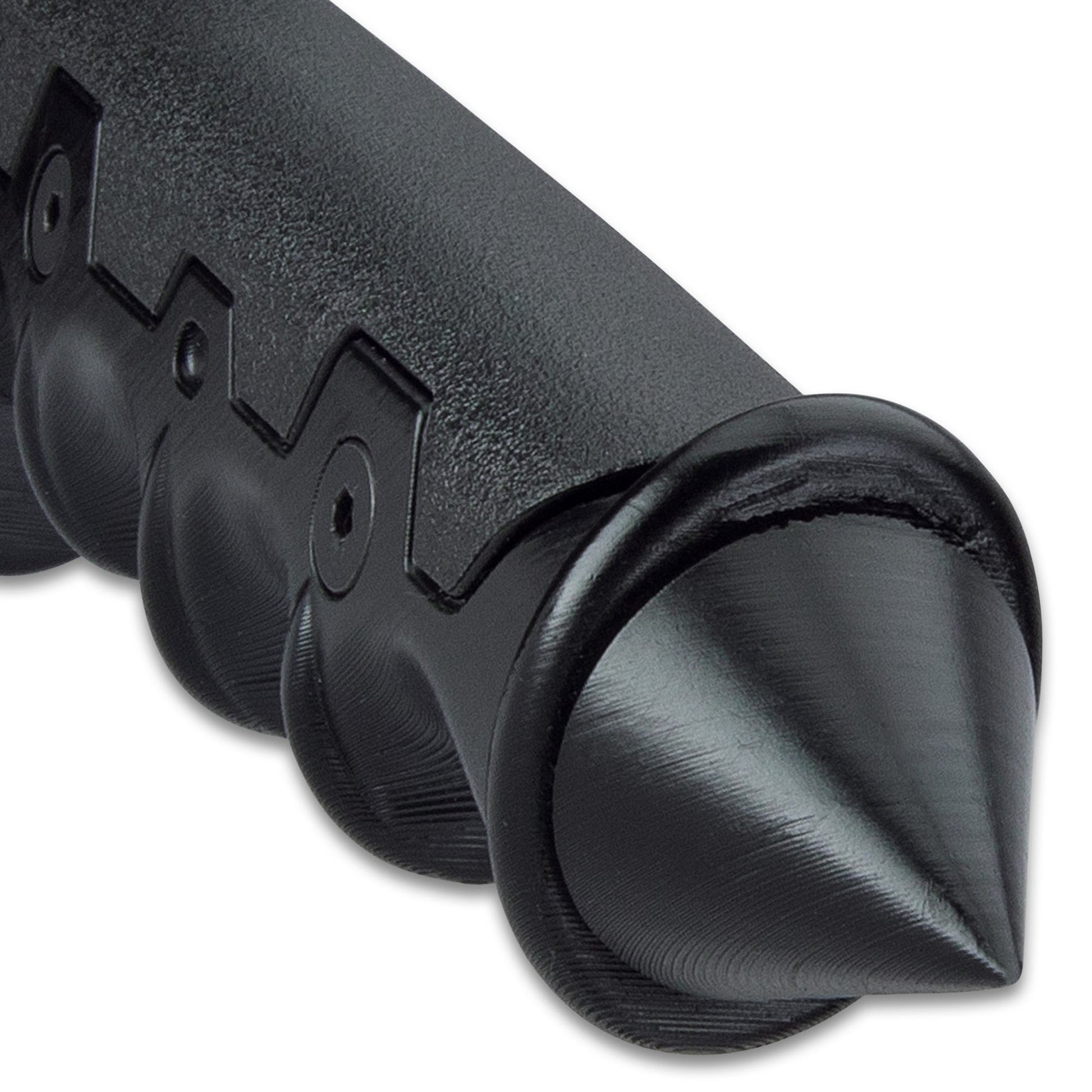 The V42 Stiletto Dagger features an impressive 8 1/8" 1065 carbon steel blade with a durable hard black coating, narrowing down to a penetrating point for optimal performance in combat situations. The handle, crafted from cast aluminum, is designed with a textured black powder coating and no-slip TPR grip inserts, ensuring a secure and comfortable hold during intense action. The skull-crusher pommel adds versatility to the dagger's functionality.