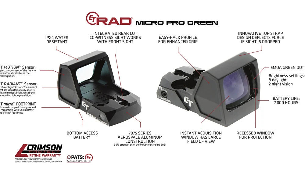 Included in the box are essential accessories, including a CR1632 battery, CT adjustment tool, mounting hardware, sight cover, and instruction manual, ensuring hassle-free installation and operation. Backed by our CRIMSON Protect Lifetime Warranty, you can trust in the quality and reliability of the CT RAD™ Micro Pro for years to come.
