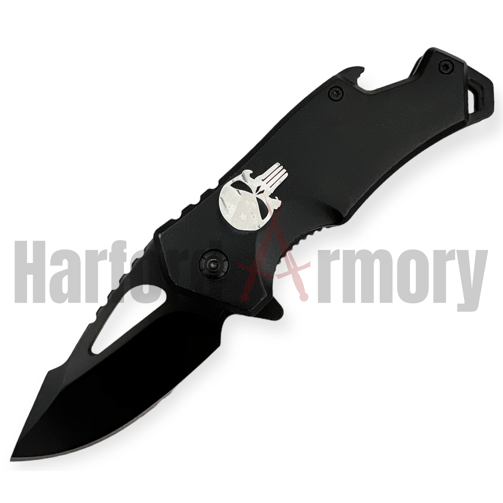 Drop Point Folding Knife with Beer Bottle Opener,Black with Skull