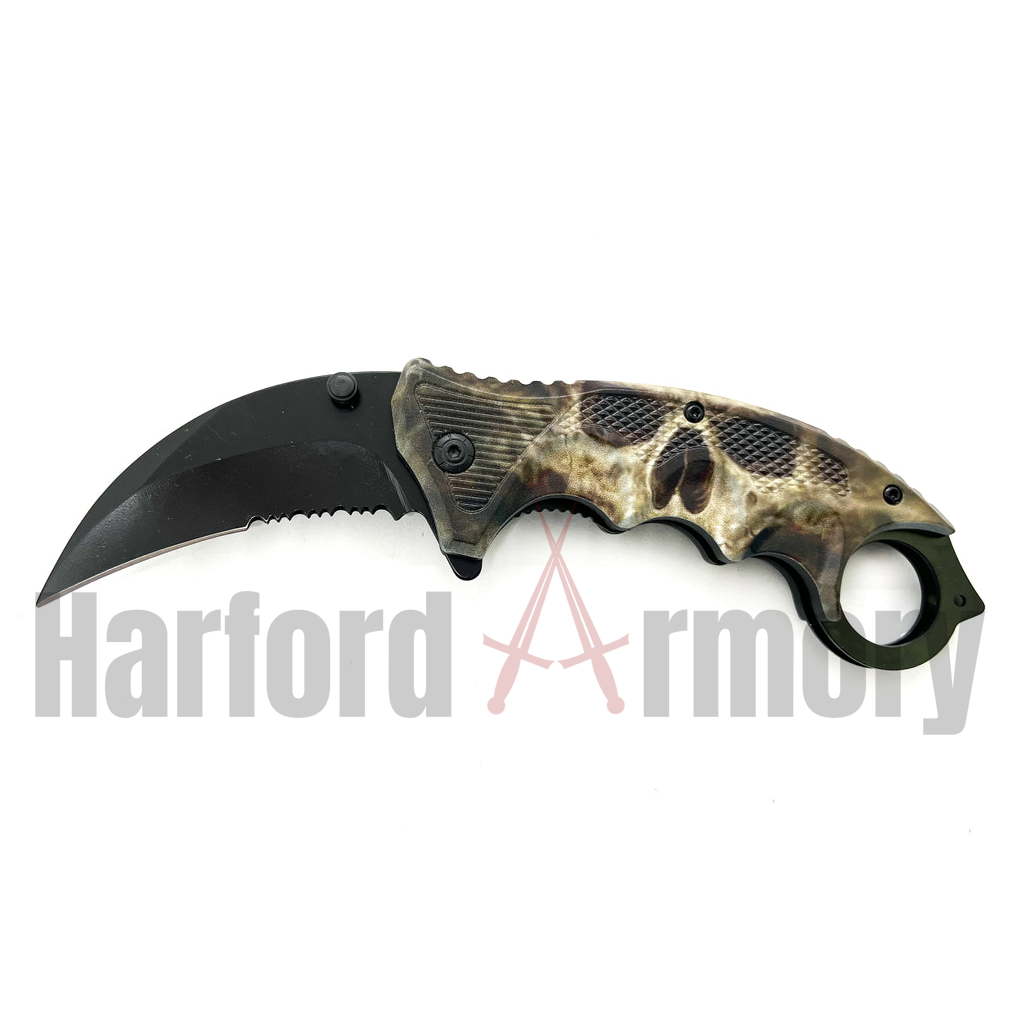 Introducing the Green Skull Folding Karambit Knife with Clip by Tiger-USA® – a formidable companion for your everyday adventures. Crafted with precision and style, this knife boasts a 7.5-inch overall length and features a robust 1065 German Surgical Steel Blade for unparalleled strength and durability.