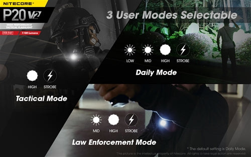 Designed for military, tactical, and hunting uses, the P20 v2 comes with a dual-switch tailcap for one-handed operation with direct access to strobe. Customize your experience with three operating modes: tactical mode, law enforcement mode, and daily mode for various scenarios.