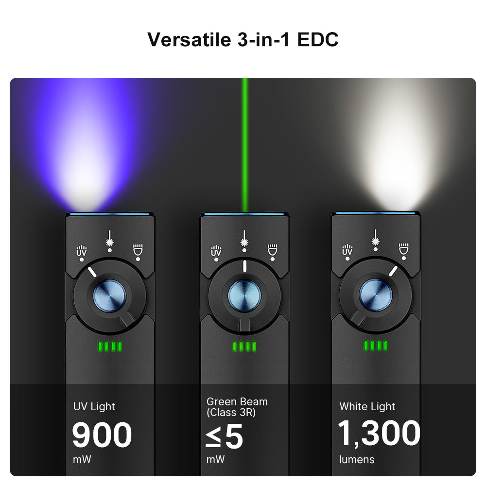 Combines 1,300lm white light, 900mW UV light, and Class 3R green laser.