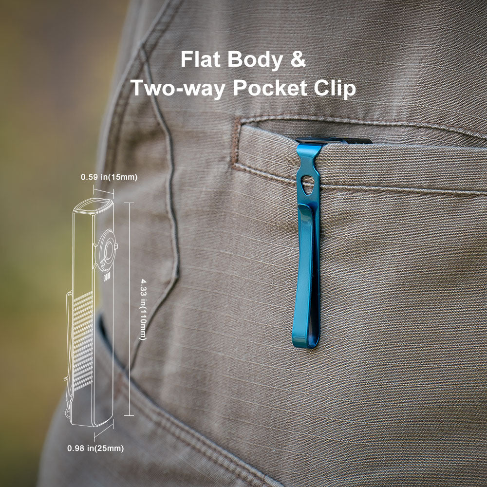- Extras: Two-way pocket clip, lanyard hole, magnetic base