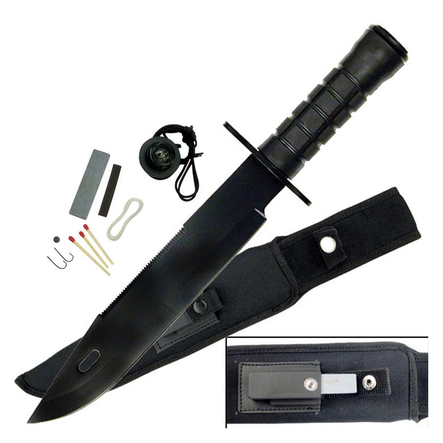 Crafted for comfort and functionality, the metal handle boasts a rubberized textured grip, making it both comfortable and easy to hold in various conditions. But this knife is more than just a blade – it's a survival toolkit. The screw-off butt cap reveals a compass for navigation, while the handle houses a survival kit, including fishing line with hook and weight, matches for fire-starting, and sandpaper.