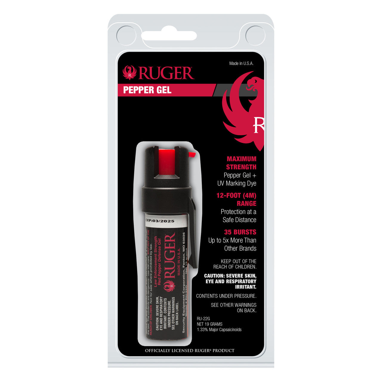 With an industry-leading 35 bursts (5x more than the competition), the Ruger Pepper Gel with Clip ensures you're prepared to handle multiple threats confidently. Its impressive 12-foot (4-meter) range provides protection from a safe distance, while the powerful gel stream effectively neutralizes assailants without the risk of wind blowback, making it suitable for indoor use as well.