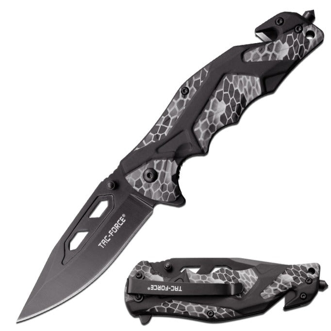 Special Features: The spring-assisted folding mechanism ensures quick and easy deployment. Dual thumb studs provide ambidextrous functionality, and the liner lock guarantees secure blade stabilization. The black and grey snake print camo aluminum handle adds a tactical edge, while the integrated glass punch, rope cutter, and pocket clip enhance its utility.