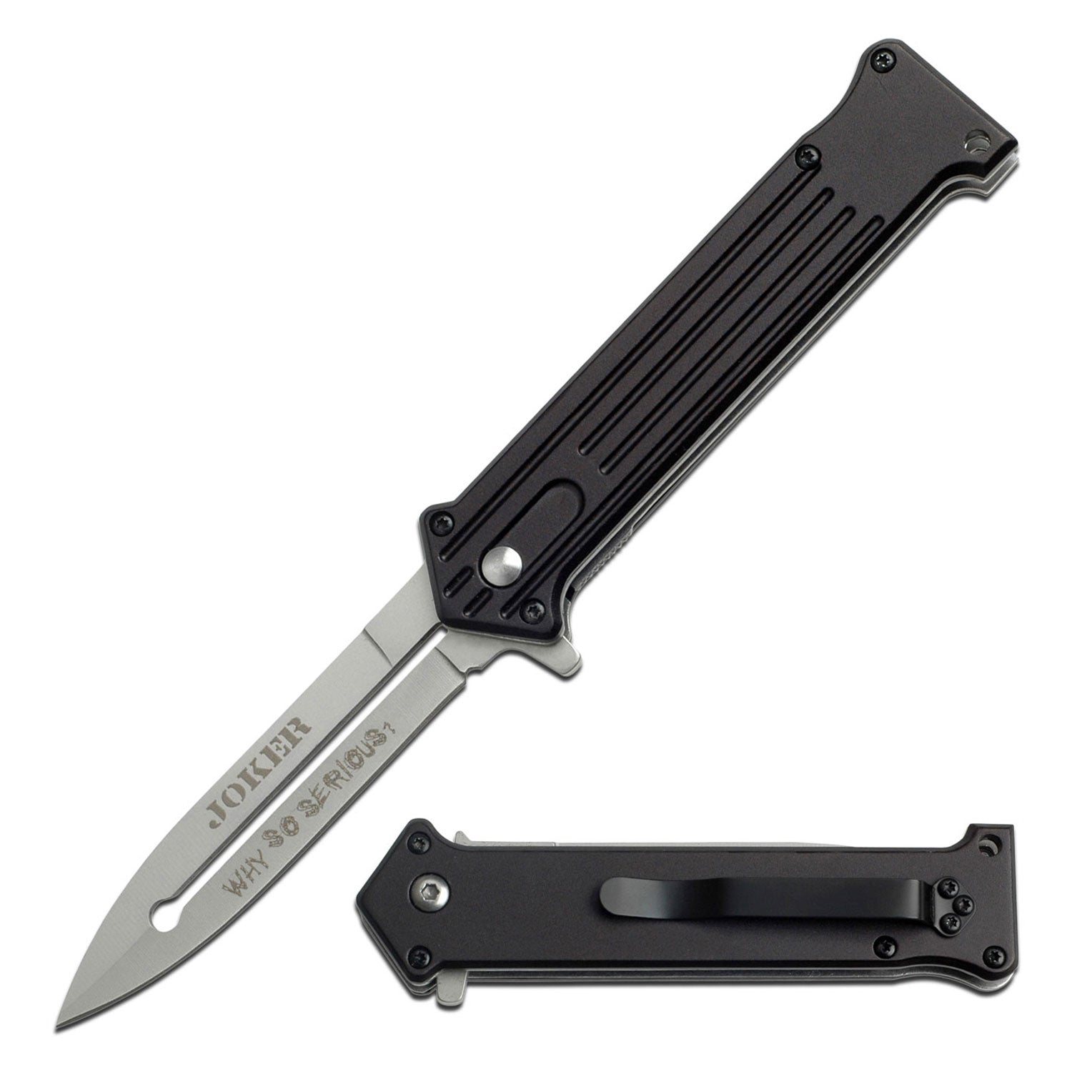 Dynamic Blade Design: The TAC-FORCE Joker Stiletto boasts a 3-inch stainless steel blade with a satin finish, featuring an intricately lasered Joker design. This eye-catching detail adds a touch of personality to the blade, making it a conversation starter.