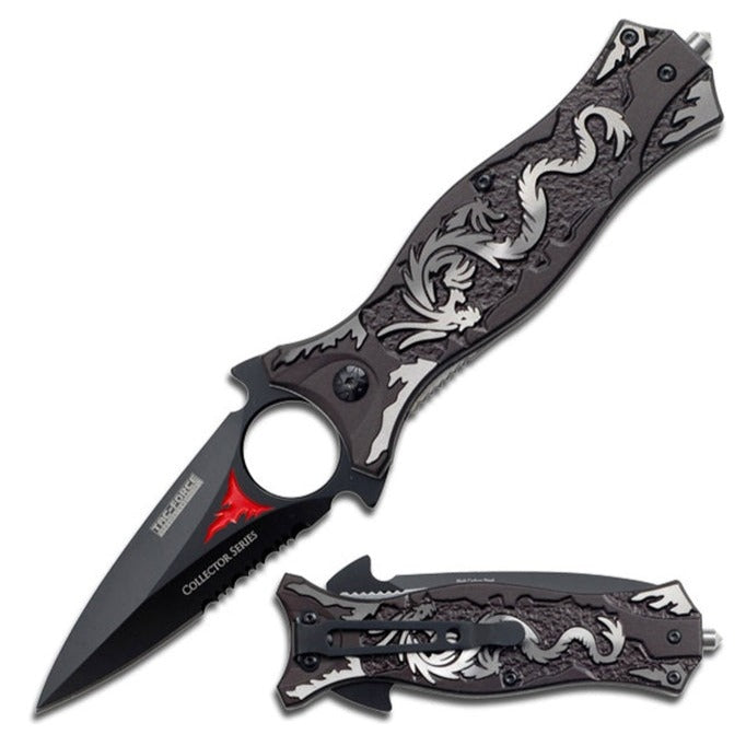 With its elegant grey dragon design, the Tac-Force Spring Assisted Knife in Grey is more than a tool; it's a fashion-forward accessory for those who appreciate style and substance. Elevate your everyday carry and embrace the fusion of functionality and sophistication with this exceptional spring-assisted pocket knife.