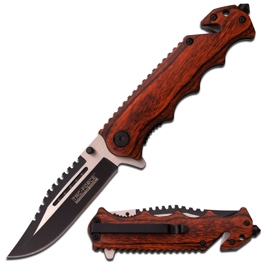 Unlock Reliability with Tac-Force Pakkawood Rescue Assisted Opening Folding Knife with Seat Belt Cutter, Glass Breaker, and Pocket Clip.