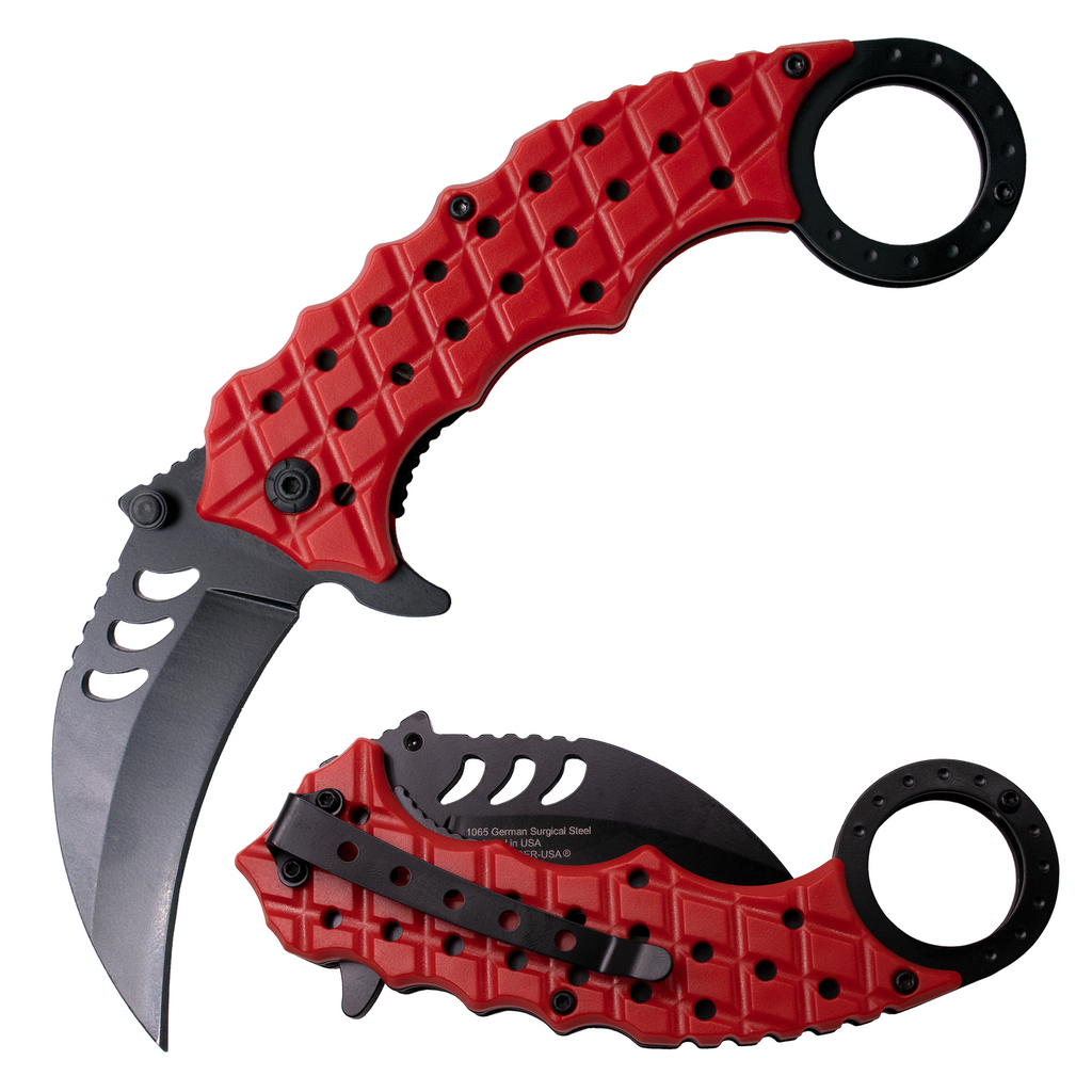 Whether you're a collector, outdoor enthusiast, or someone in need of a reliable everyday carry, the Karambit Assisted Opening Folding Knife delivers on both style and performance. Elevate your knife collection with this dynamic and versatile folding knife that seamlessly blends innovation with traditional craftsmanship. Embrace the fusion of style and utility with this red-handled Karambit – your go-to choice for cutting-edge functionality.