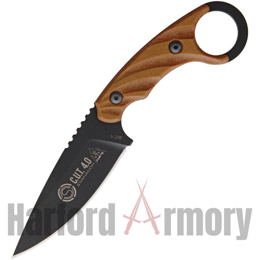 The C.U.T. 4.0 is designed as a combative ring-knife with a utility-style blade suitable for field use. Joshua Swanagon, drawing from his martial arts background, aimed to create a knife that combines the comfort and effectiveness of a karambit for combat with the practicality of a field knife.