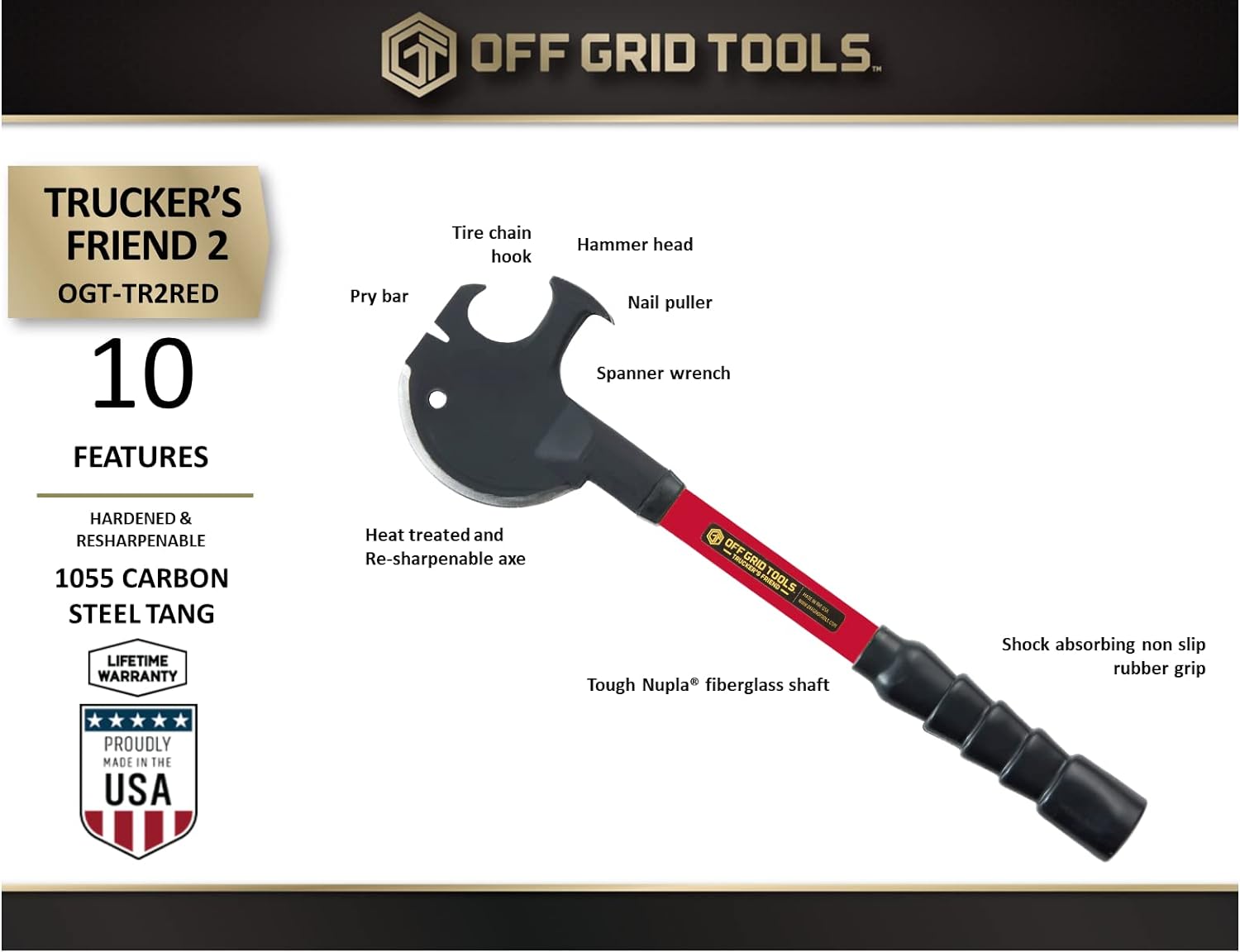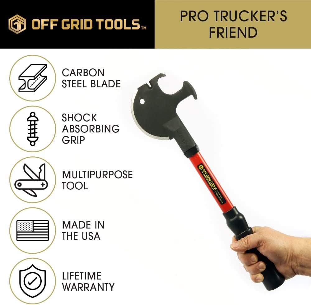 | Introducing the Truckers Friend – the ultimate multi-tool designed for versatility, durability, and reliability. The Trucker's Friend boasts an impressive 18.25-inch (46.36cm) overall length, making it a powerhouse in the hands of truckers, outdoor enthusiasts, and anyone in need of a reliable all-in-one tool. Crafted with precision and ruggedness in mind, the Truckers Friend features a 5.25-inch black oxide coated 1055HC steel axe head with a 4.5-inch cutting edge. This combination ensures not only a sharp and efficient cutting surface but also exceptional resilience in challenging conditions. The red fiberglass shaft, paired with a black rubber grip, provides a comfortable and secure hold, allowing you to tackle various tasks with ease. The Truckers Friend 2 is not just an axe – it's a complete toolset. With a nail puller, wire twist, pry bar, tire chain hook, hammer, and recessed nail puller, this multi-tool covers a wide range of needs, making it an indispensable companion for your adventures or work on the road. The Truckers Friend weighs in at a mere 1.88 pounds, making it lightweight enough to carry wherever the job takes you. The dimensions of 18.25 × 4 × 1.5 inches ensure that it's compact and portable without compromising on functionality. Proudly made in the USA, the Truckers Friend by Off Grid Tools embodies American craftsmanship and quality. Whether you're a professional trucker, a camper, or someone who values a reliable multi-tool, the Truckers Friend is your go-to solution for any task that comes your way. Invest in the best, and let the Truckers Friend be your trusted companion on every journey. |