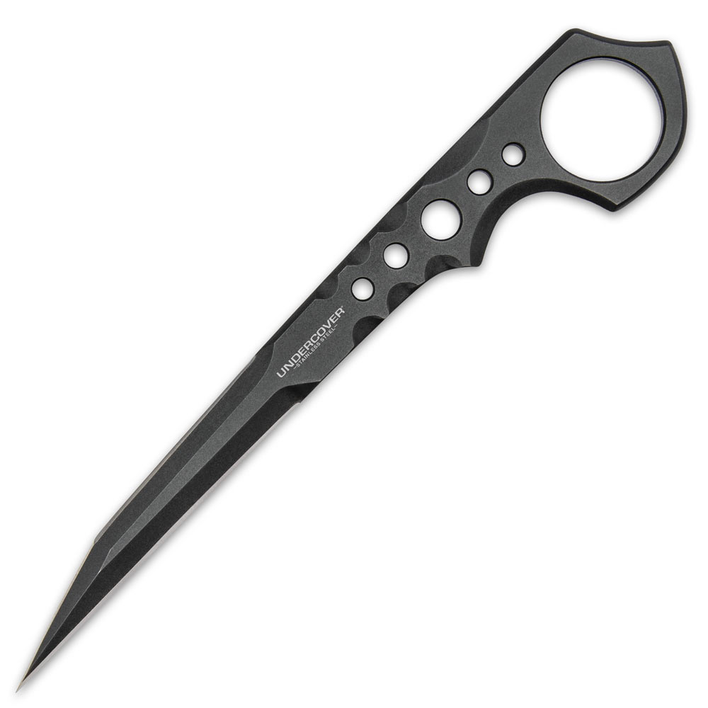 Crafted from one solid piece of 3Cr13 stainless steel, the Undercover CIA Stinger II boasts a slim 3 1/2" blade with a non-reflective black coating, culminating in a straight-edged penetrating point. The handle is designed with CNC-beveled edges and grooves, ensuring a secure grip for effective use in any situation. The open-ring pommel and thru-holes add versatility to the knife's functionality.