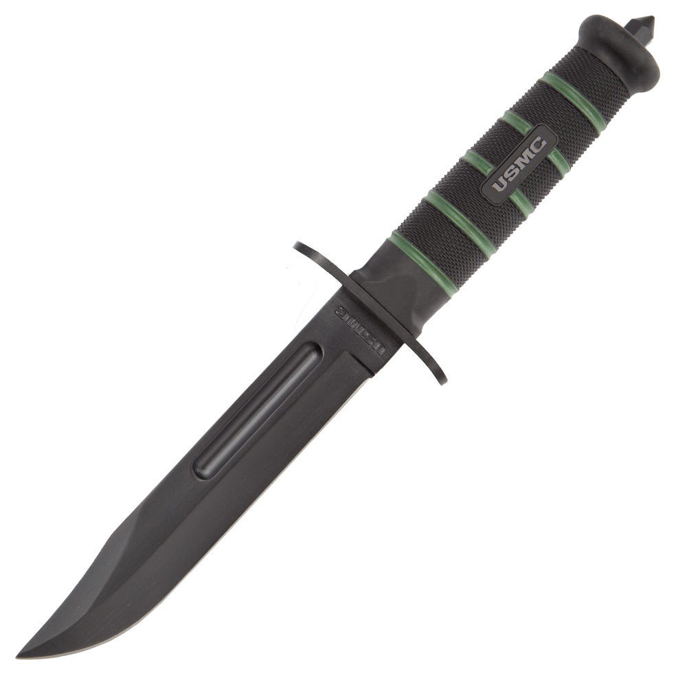Blade: 6 3/4" 420 Stainless Steel with Clip Point Profile, Nonreflective Black Coating, Blood Groove, and ‘USMC’ Stamp